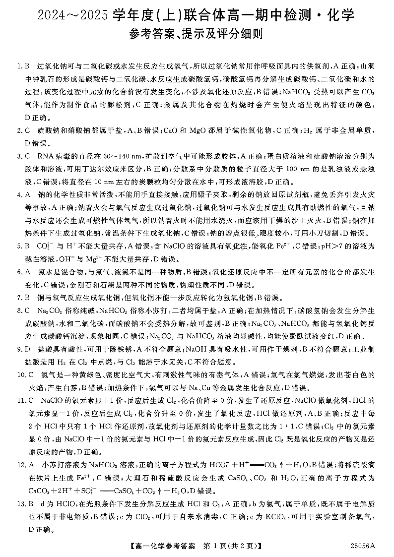 辽宁省沈阳市联合体2024-2025学年高一上学期11月期中考试 化学答案