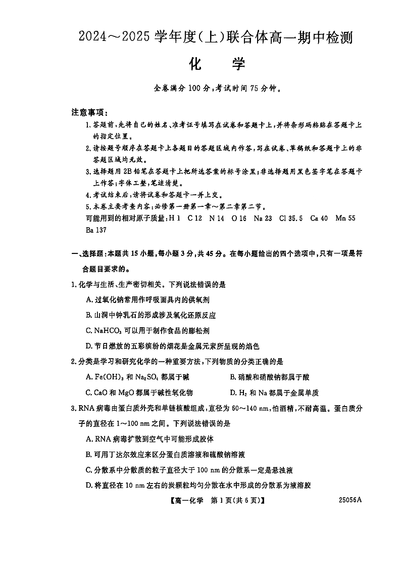 辽宁省沈阳市联合体2024-2025学年高一上学期11月期中考试 化学