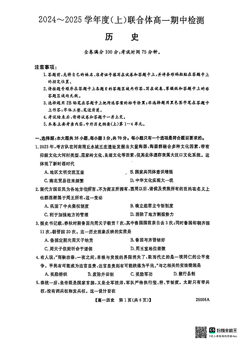 辽宁省沈阳市联合体2024-2025学年高一上学期11月期中考试 历史