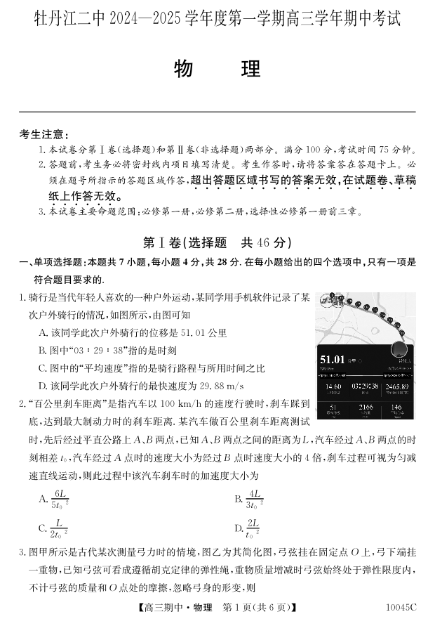 黑龙江省牡丹江市第二高级中学2025届高三上学期11月期中考试 物理