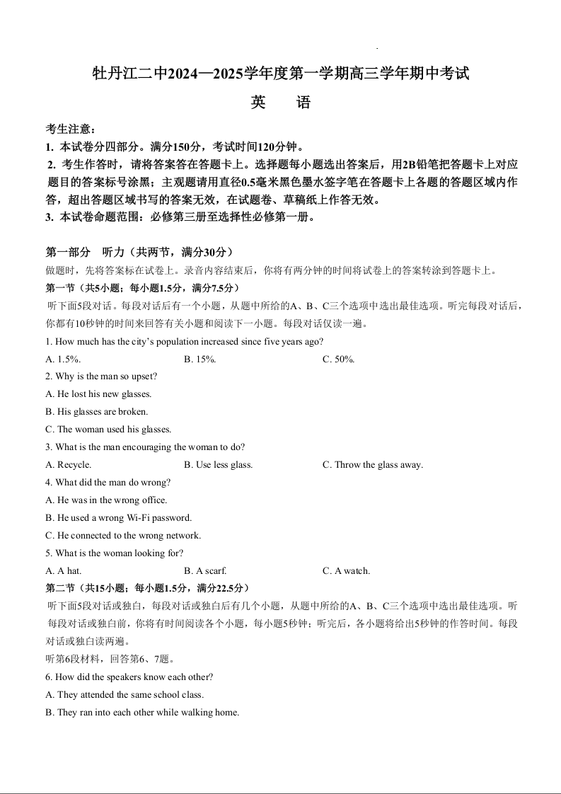 黑龙江省牡丹江市第二高级中学2025届高三上学期11月期中考试 英语