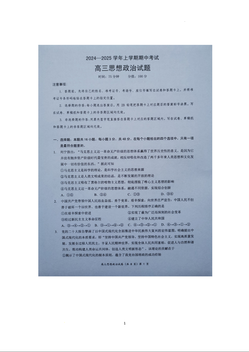湖北省新高考协作体2024-2025学年高三上学期11月期中考试 政治