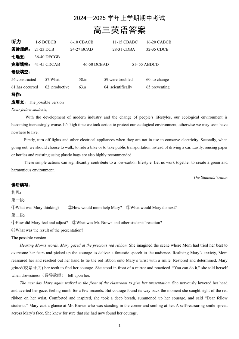 湖北省新高考协作体2024-2025学年高三上学期11月期中考试 英语答案