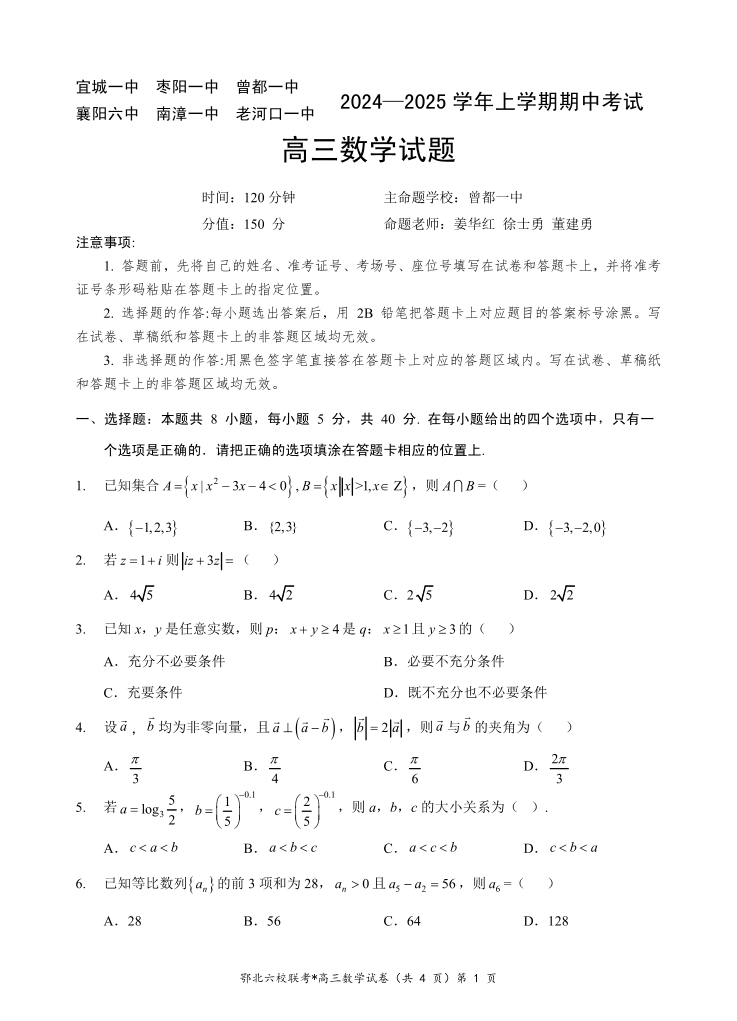 湖北省新高考协作体2024-2025学年高三上学期11月期中考试 数学