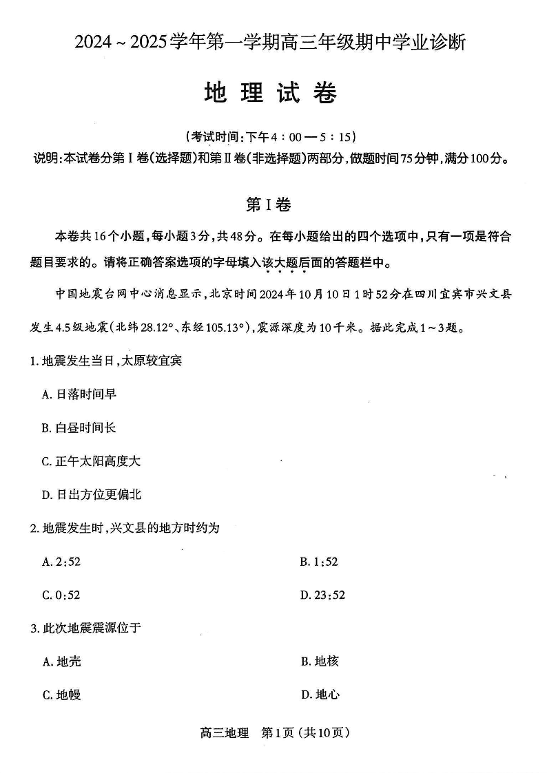 山西省太原市2024-2025学年高三年级第一学期期中测评 地理