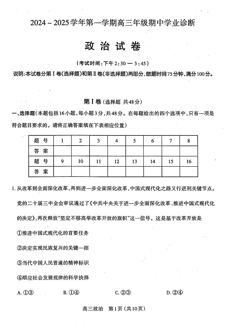 山西省太原市2024-2025学年高三年级第一学期期中测评 政治