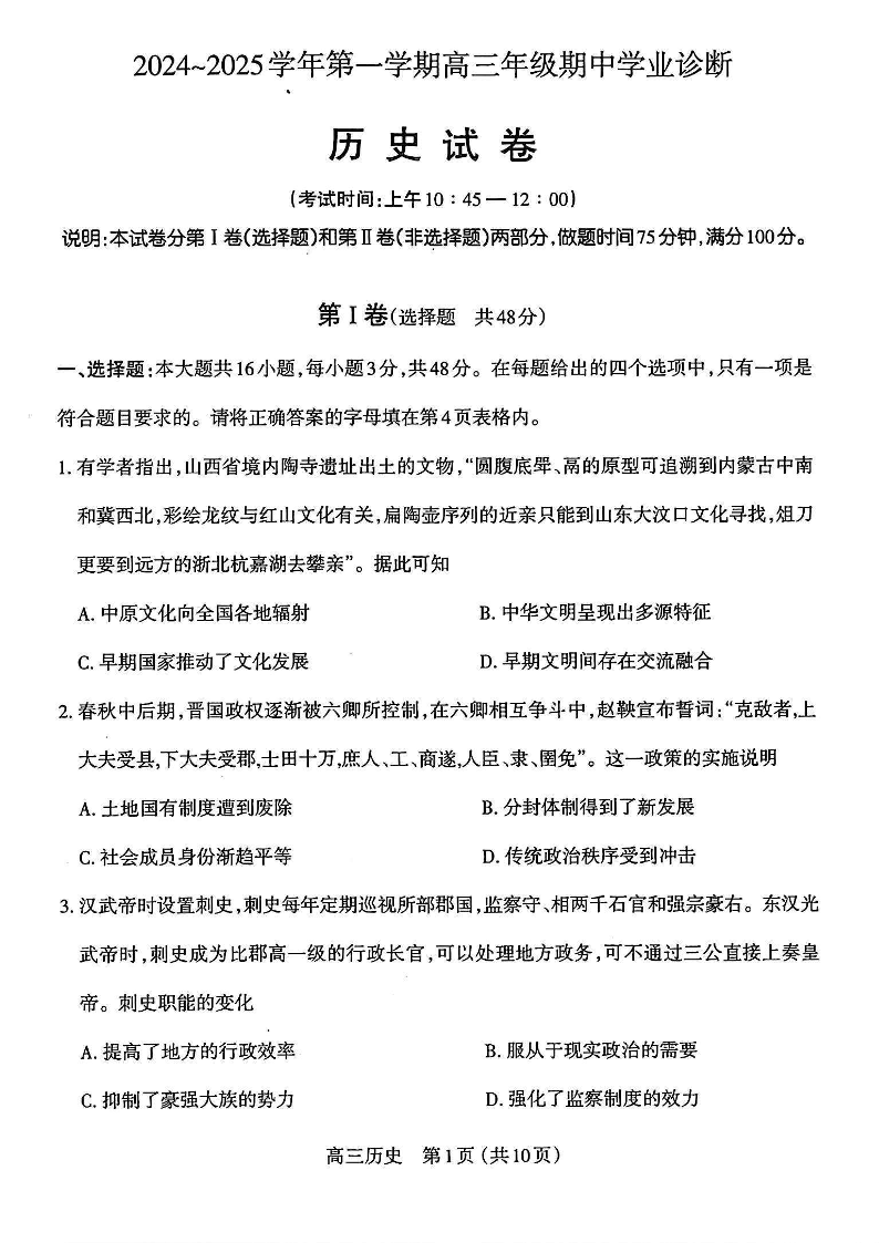 山西省太原市2024-2025学年高三年级第一学期期中测评 历史