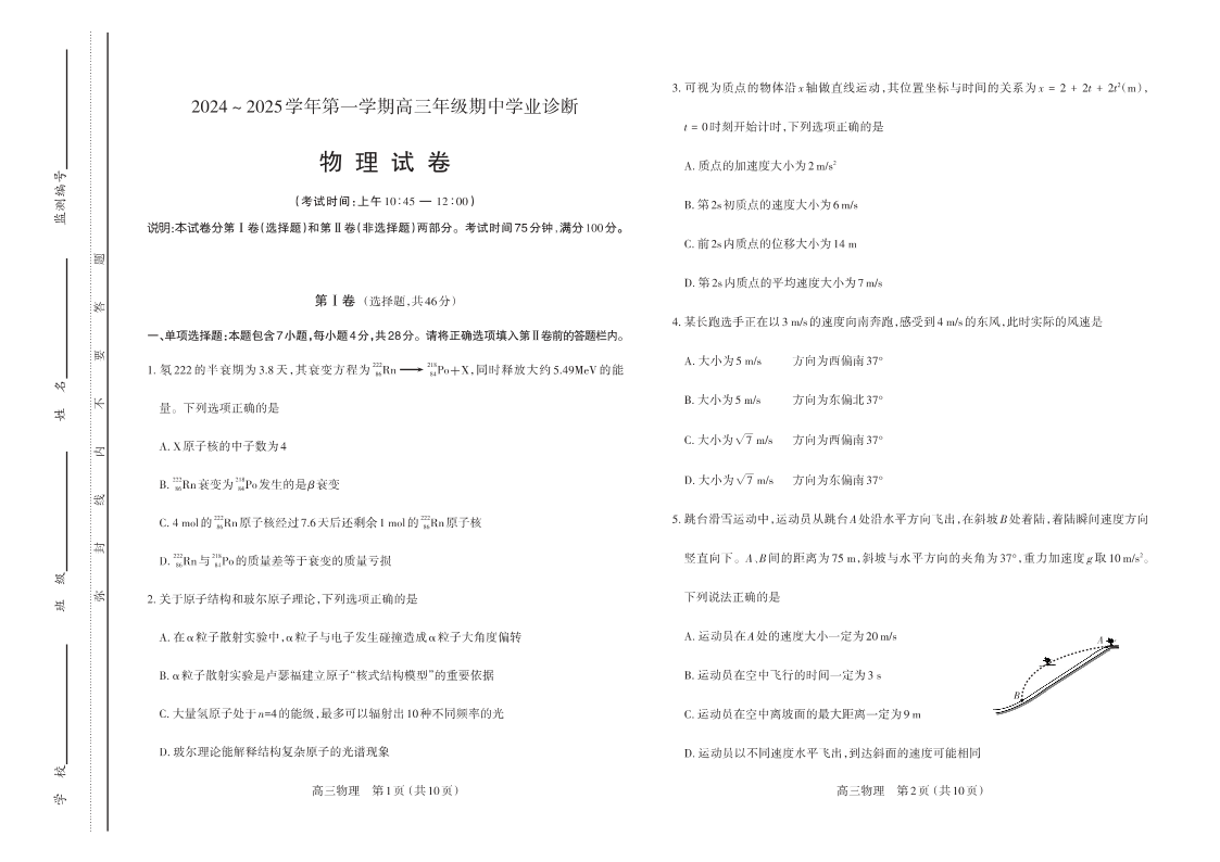 山西省太原市2024-2025学年高三年级第一学期期中测评 物理