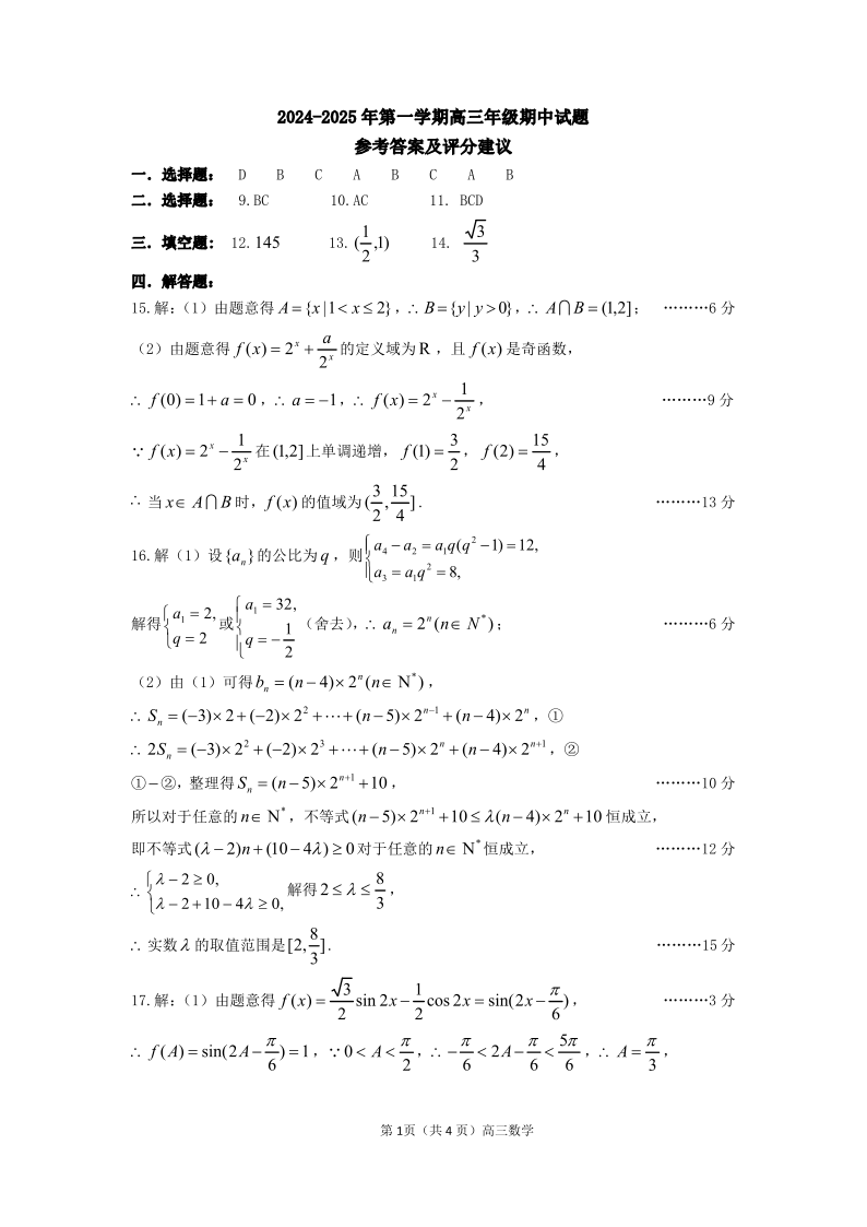 山西省太原市2024-2025学年高三年级第一学期期中测评 数学答案