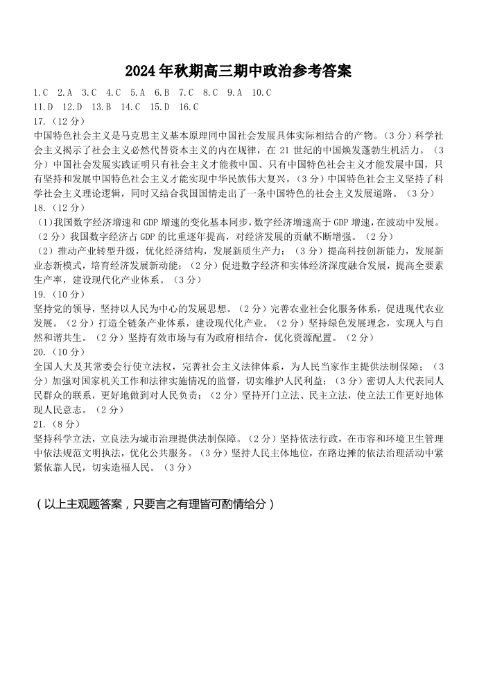 河南省南阳市2024-2025学年高三上学期11月期中考试 政治答案