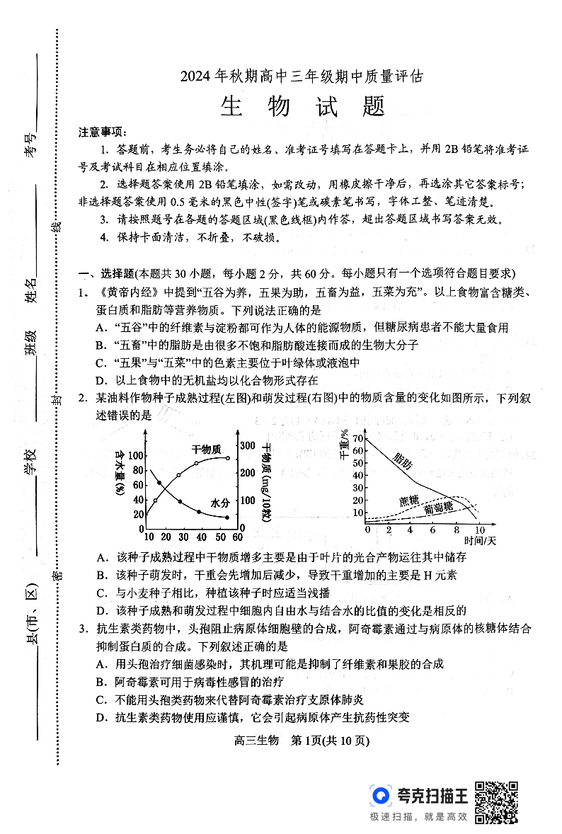 河南省南阳市2024-2025学年高三上学期11月期中考试 生物
