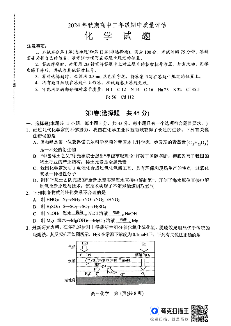 河南省南阳市2024-2025学年高三上学期11月期中考试 化学