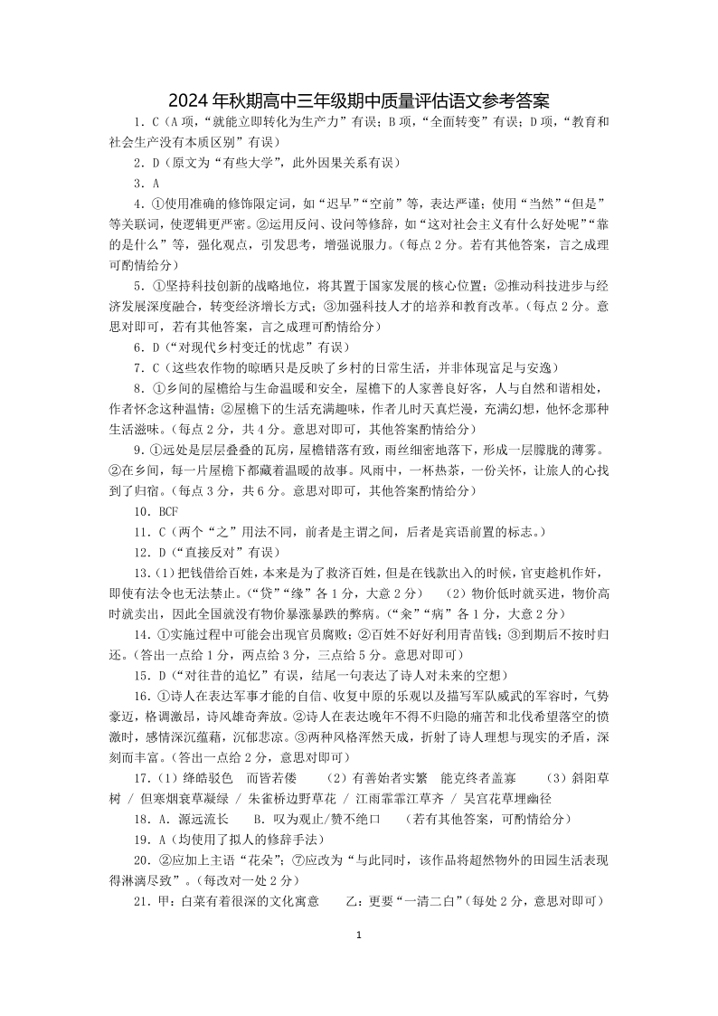 河南省南阳市2024-2025学年高三上学期11月期中考试 语文答案