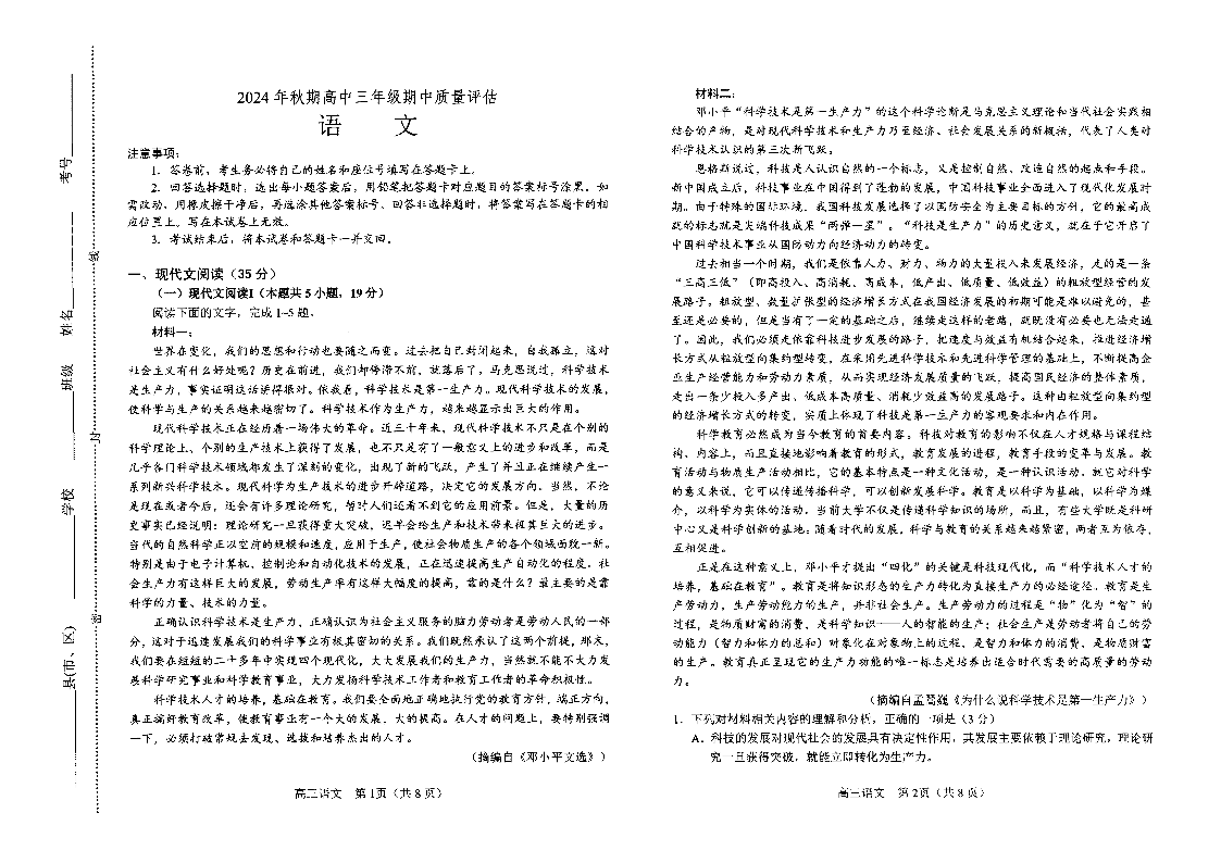 河南省南阳市2024-2025学年高三上学期11月期中考试 语文