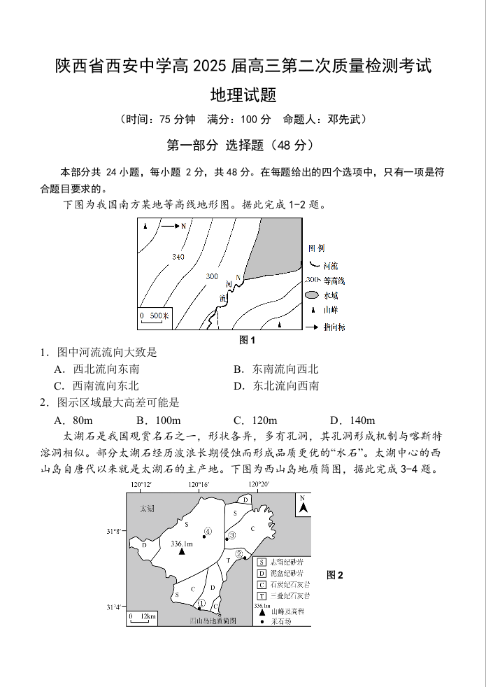 陕西省西安中学高2025届高三第二次质量检测 地理