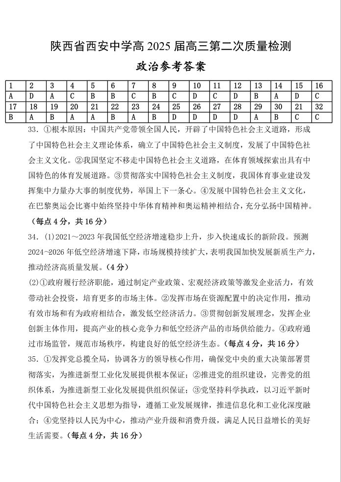 陕西省西安中学高2025届高三第二次质量检测 政治答案