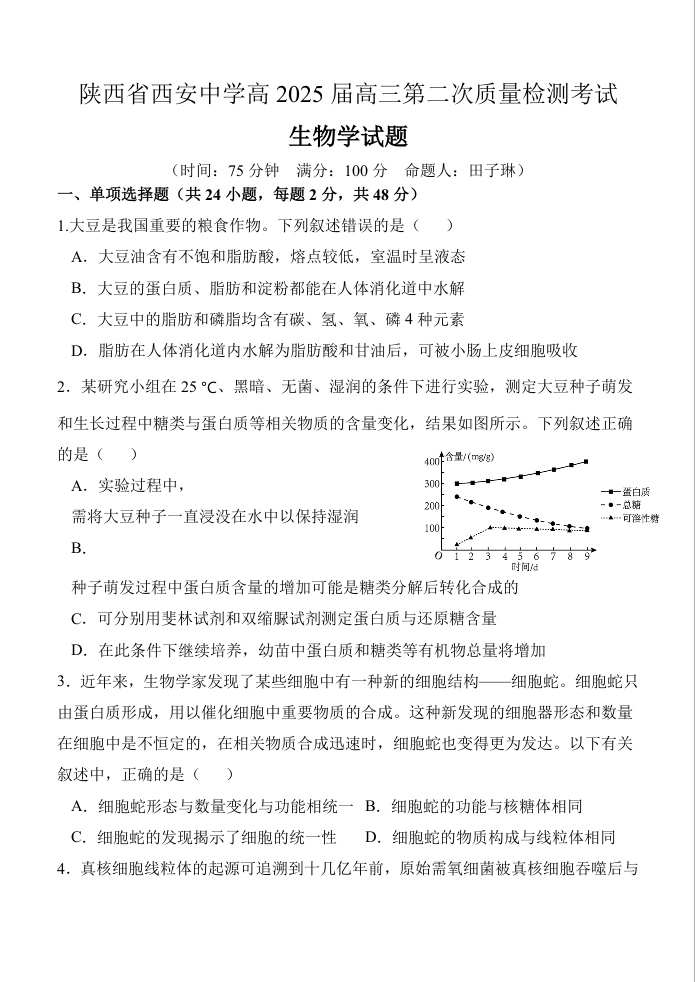 陕西省西安中学高2025届高三第二次质量检测 生物