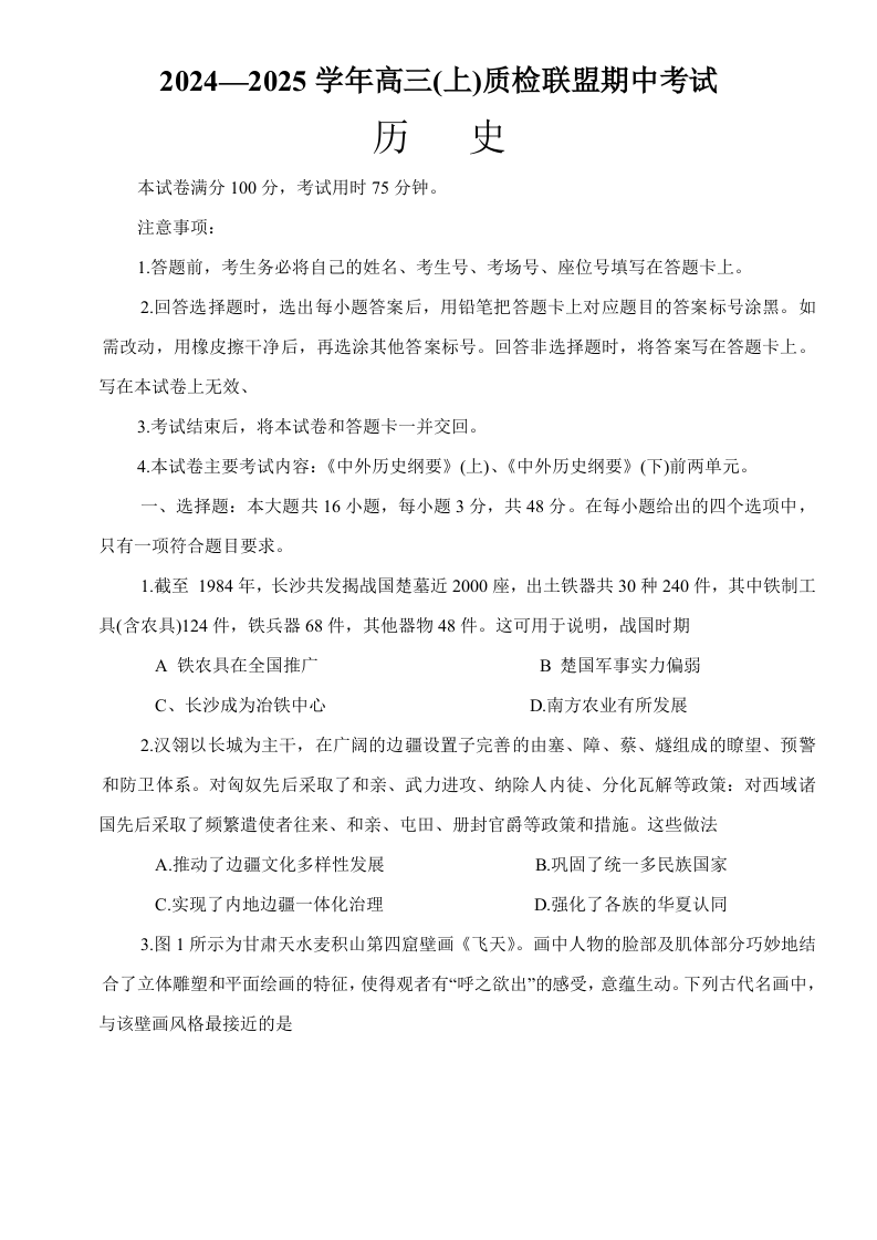 河北省邢台市质检联盟2024-2025学年高三上学期期中考试 历史