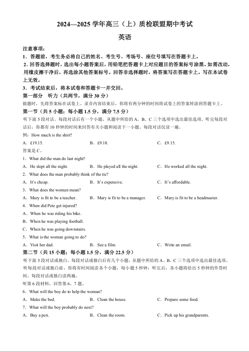 河北省邢台市质检联盟2024-2025学年高三上学期期中考试 英语