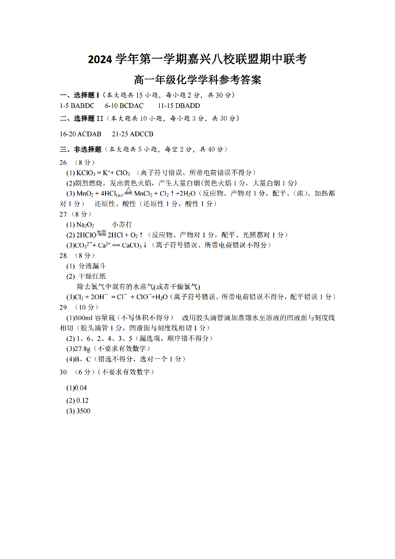 嘉兴八校联盟2024学年高一第一学期期中联考 化学答案