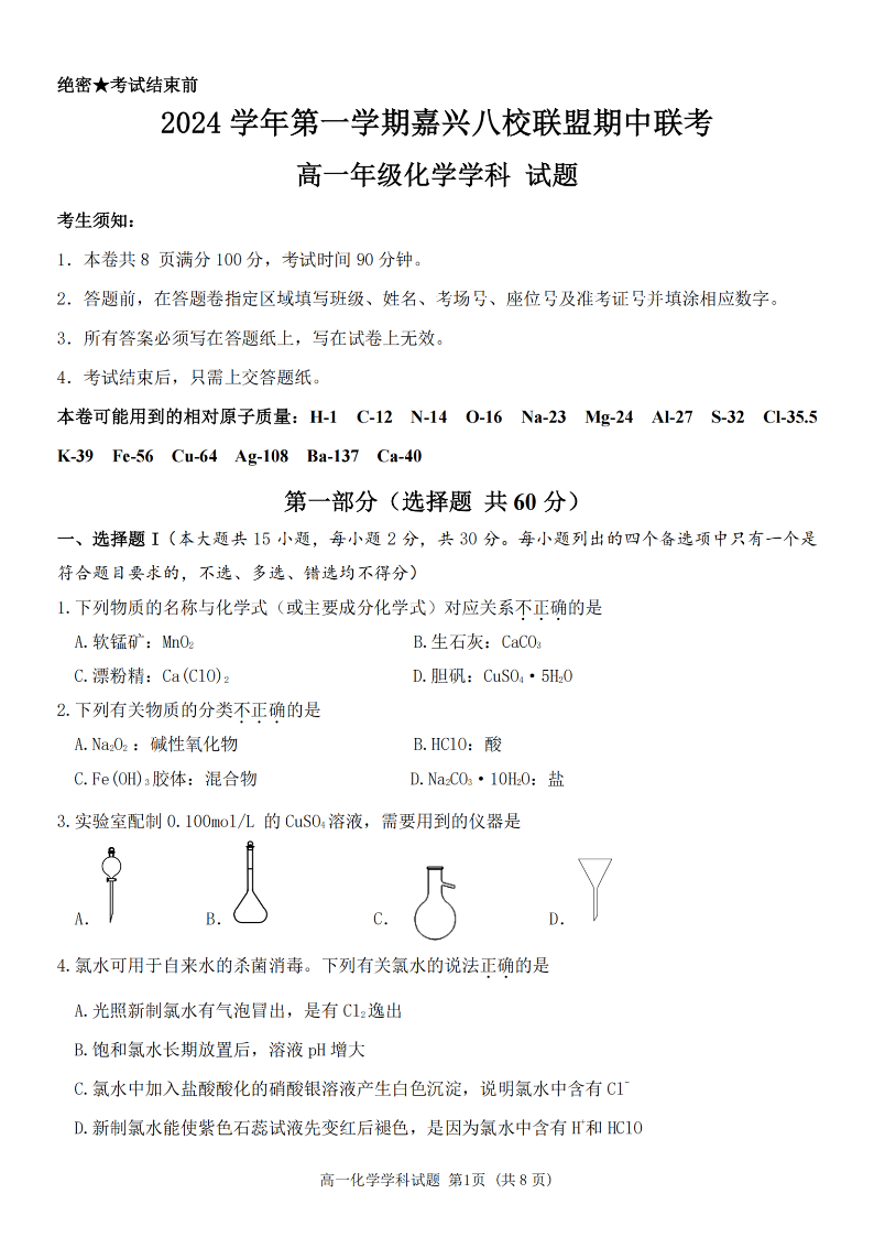 嘉兴八校联盟2024学年高一第一学期期中联考 化学