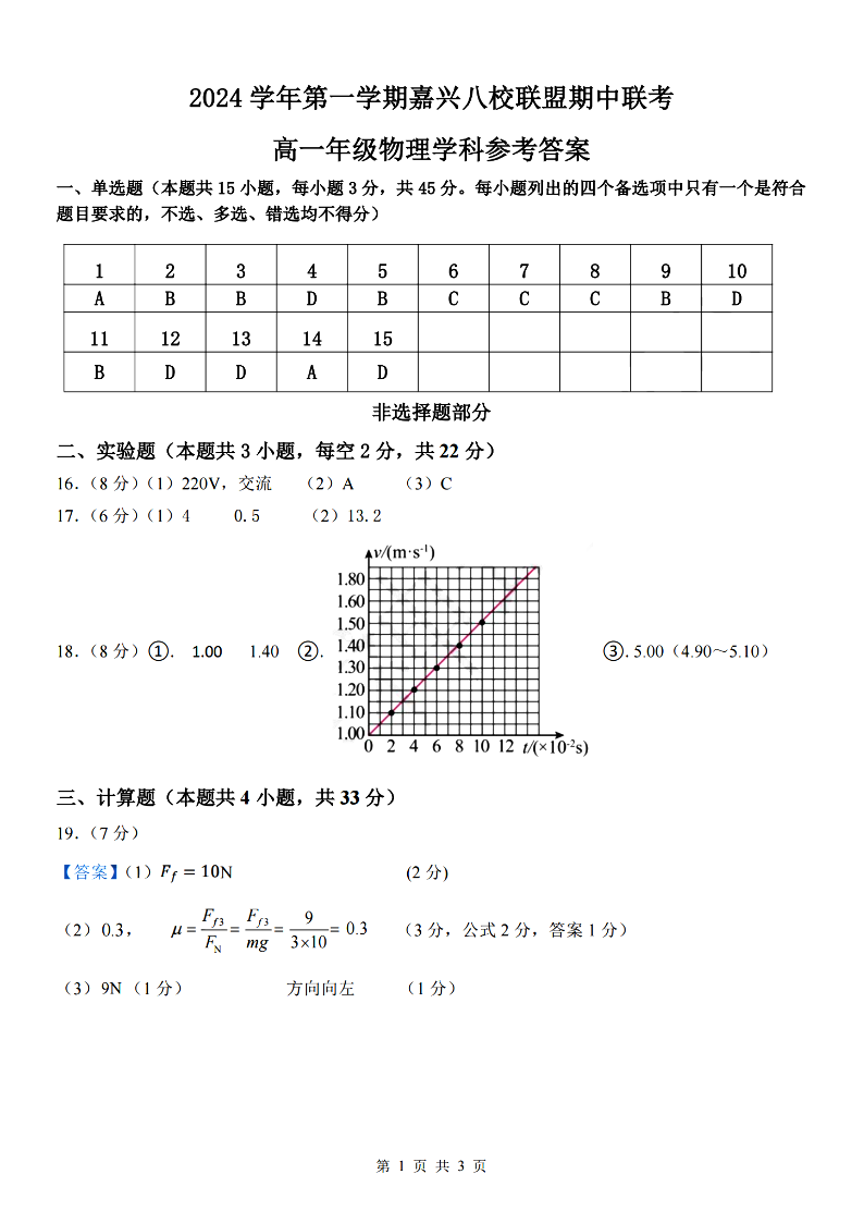 嘉兴八校联盟2024学年高一第一学期期中联考 物理答案