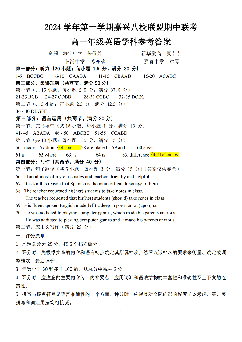 嘉兴八校联盟2024学年高一第一学期期中联考 英语答案
