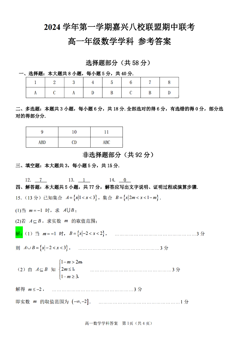 嘉兴八校联盟2024学年高一第一学期期中联考 数学答案