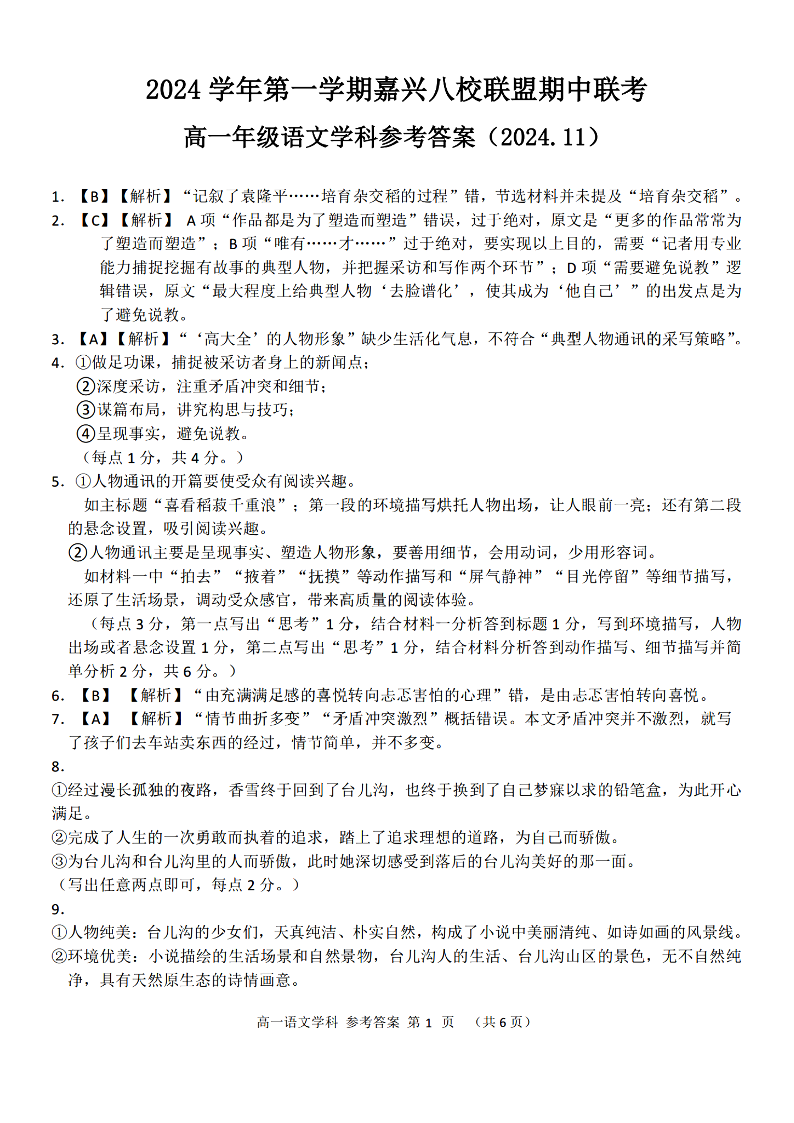 嘉兴八校联盟2024学年高一第一学期期中联考 语文答案