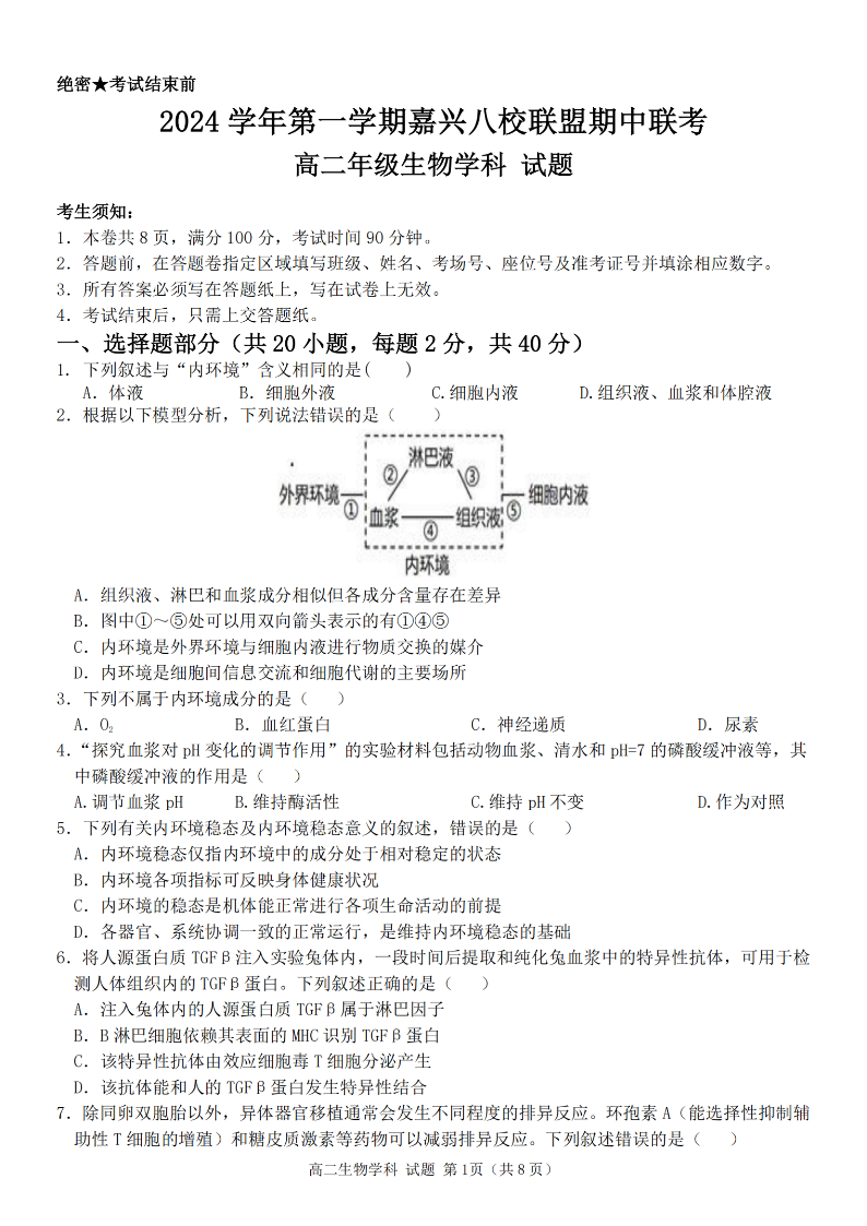 嘉兴八校联盟2024学年高二第一学期期中联考 生物