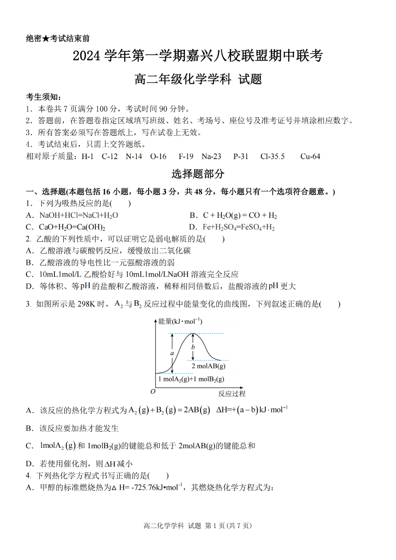 嘉兴八校联盟2024学年高二第一学期期中联考 化学