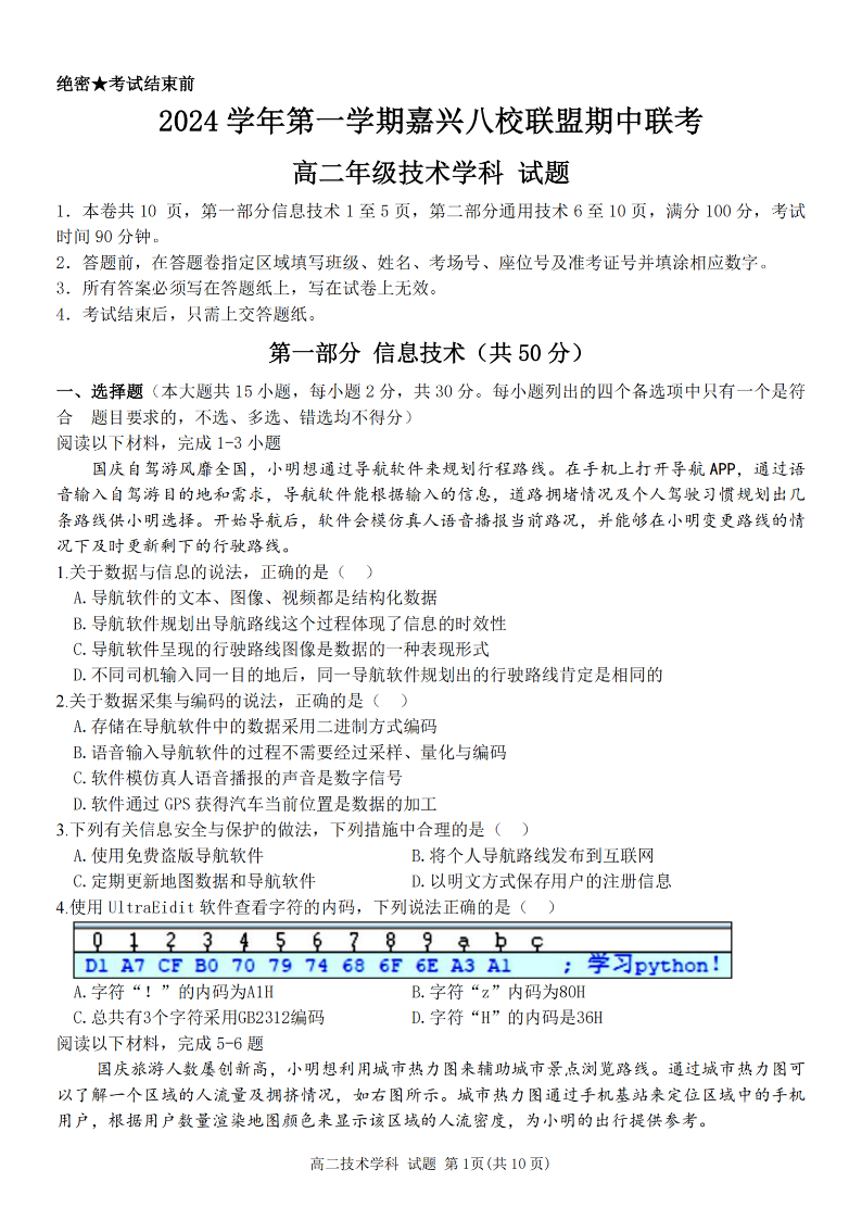 嘉兴八校联盟2024学年高二第一学期期中联考 技术