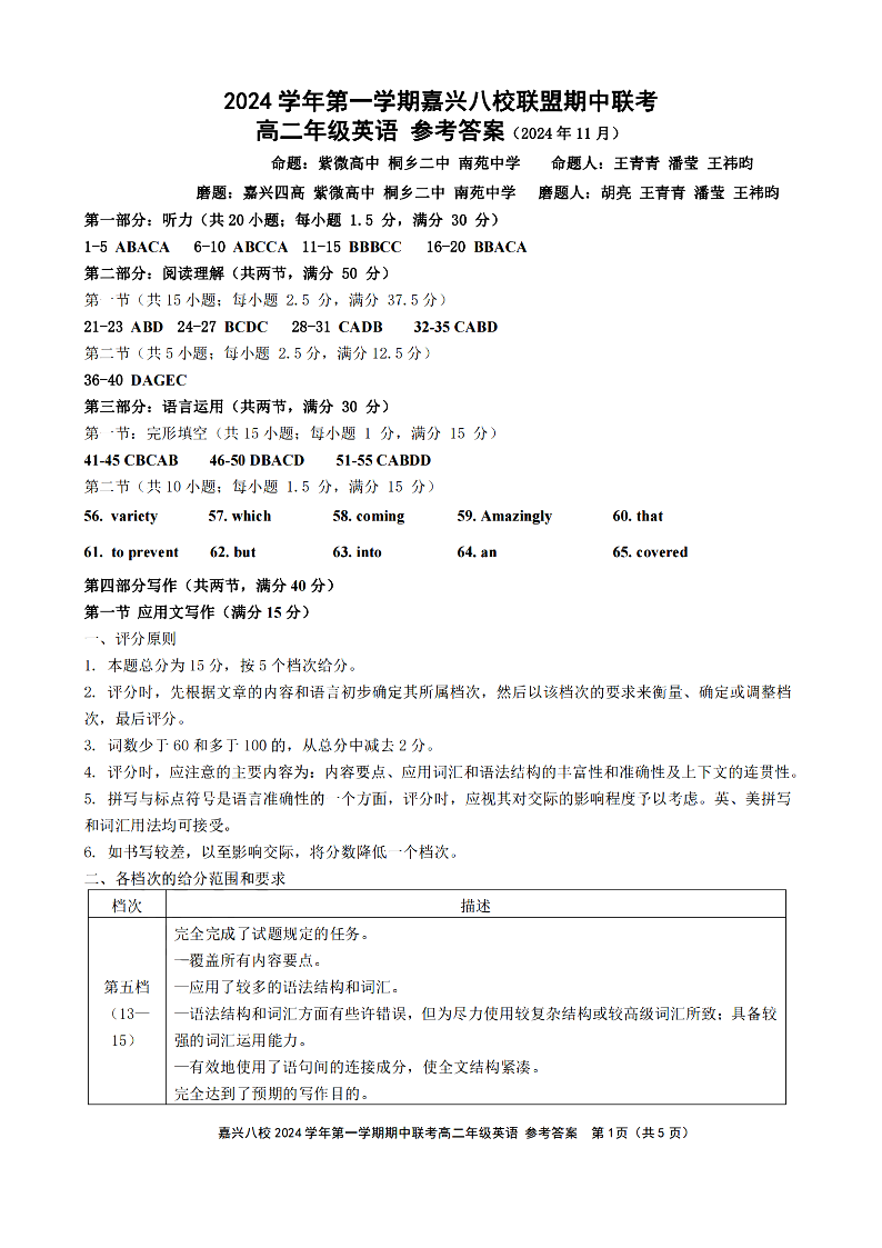 嘉兴八校联盟2024学年高二第一学期期中联考 英语答案
