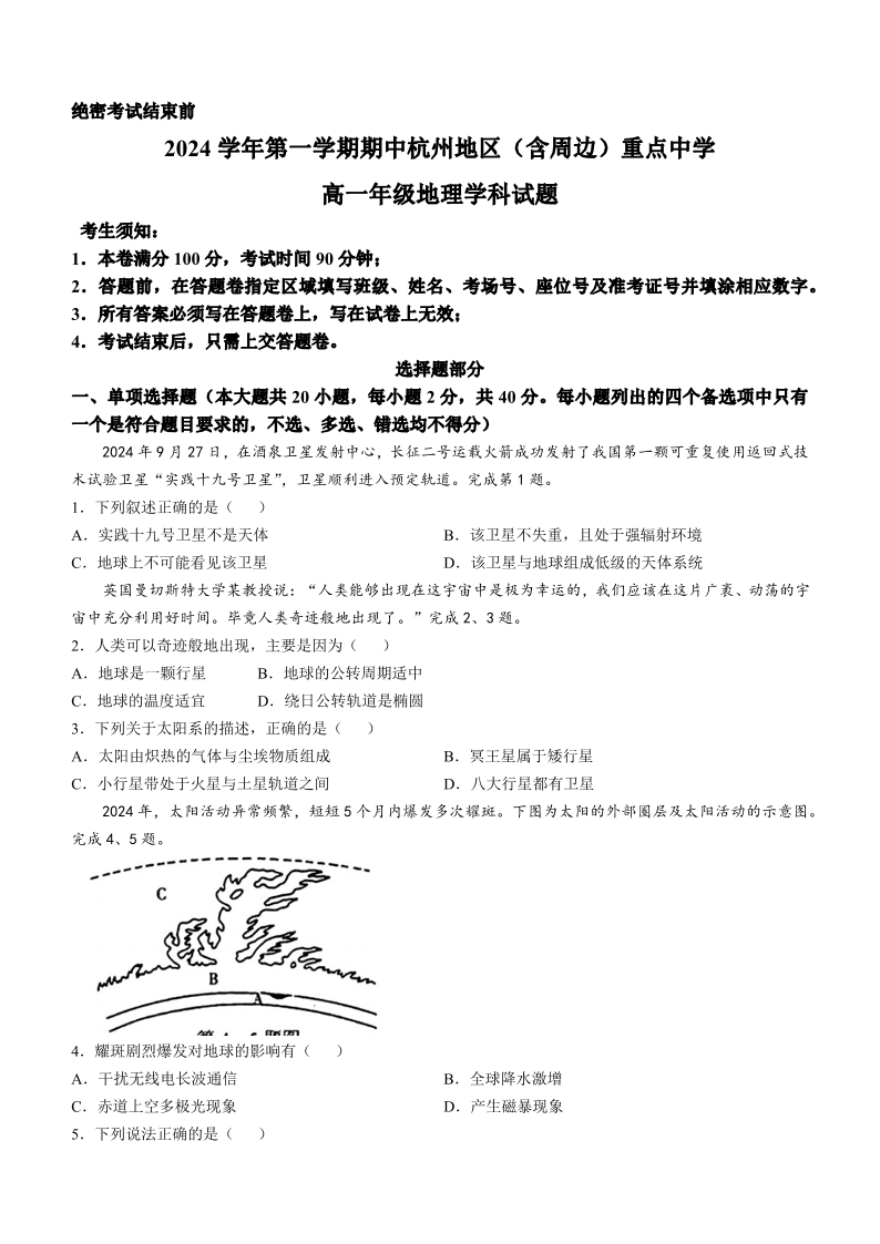 浙江省杭州地区(含周边)重点中学2024-2025学年高一上学期期中联考 地理