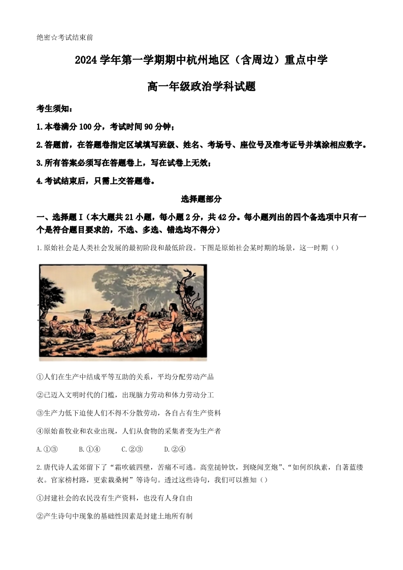 浙江省杭州地区(含周边)重点中学2024-2025学年高一上学期期中联考 政治