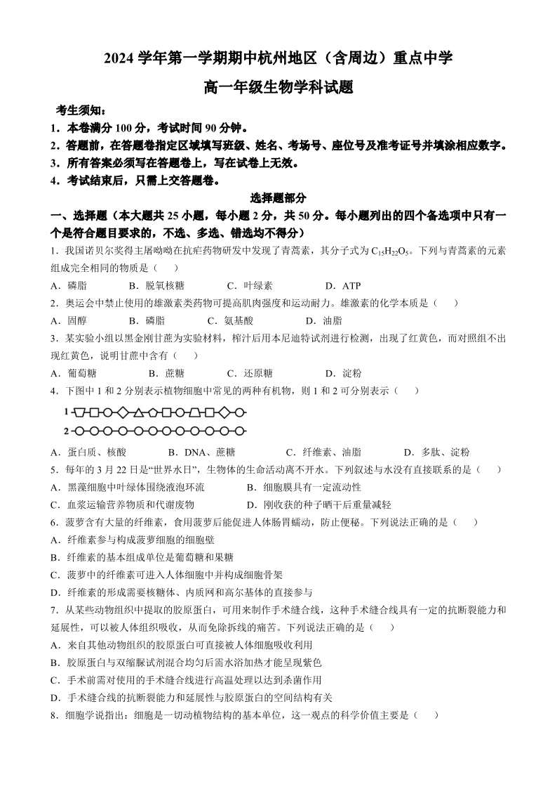 浙江省杭州地区(含周边)重点中学2024-2025学年高一上学期期中联考 生物