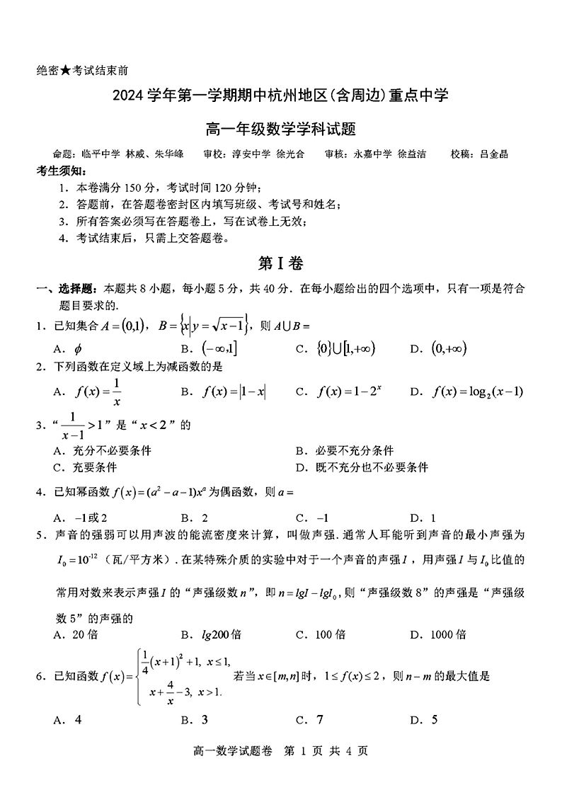 浙江省杭州地区(含周边)重点中学2024-2025学年高二上学期期中考试 数学