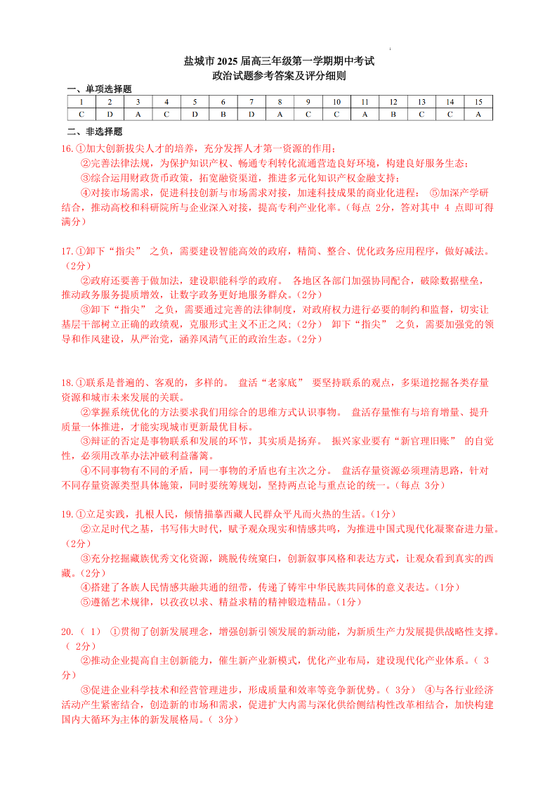 江苏省盐城市2025届高三年级第一学期期中考试 政治答案