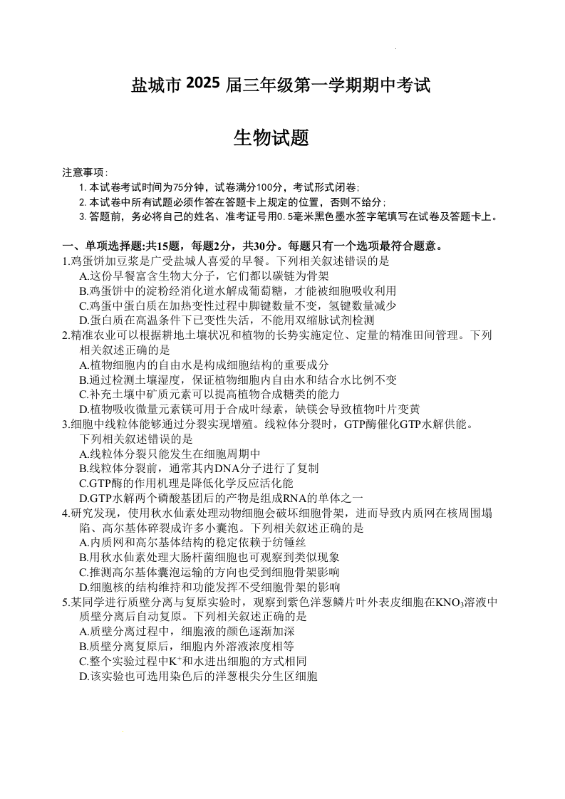 江苏省盐城市2025届高三年级第一学期期中考试 生物