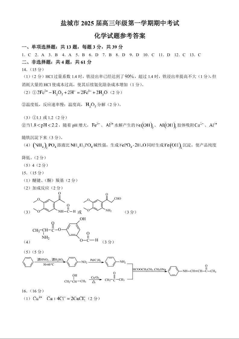 江苏省盐城市2025届高三年级第一学期期中考试 化学答案