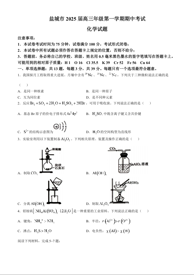 江苏省盐城市2025届高三年级第一学期期中考试 化学