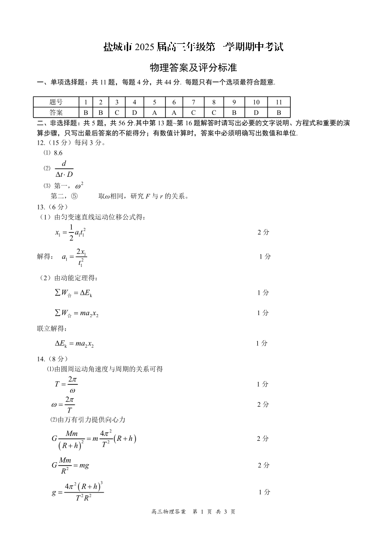 江苏省盐城市2025届高三年级第一学期期中考试 物理答案