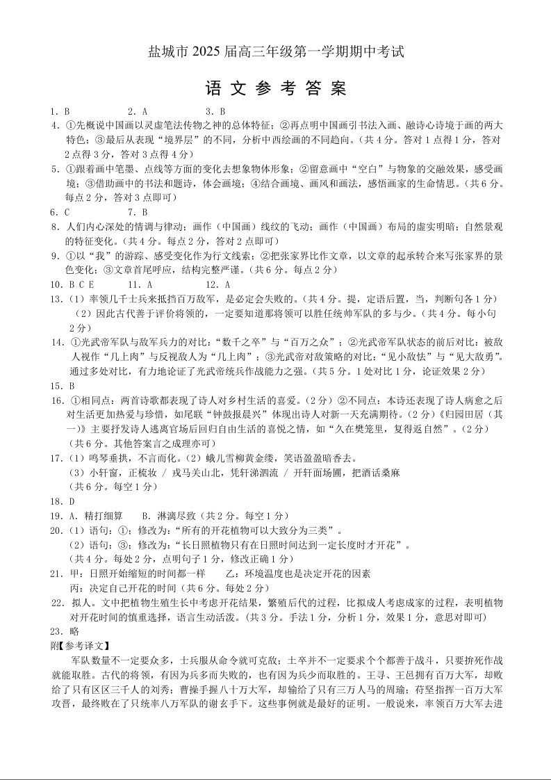 江苏省盐城市2025届高三年级第一学期期中考试 语文答案