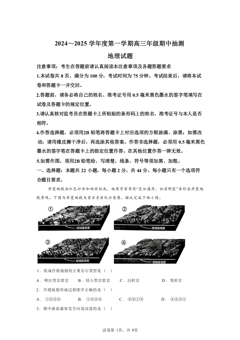 江苏省徐州市2024-2025学年2025届高三第一(上)学期11月期中抽测 地理