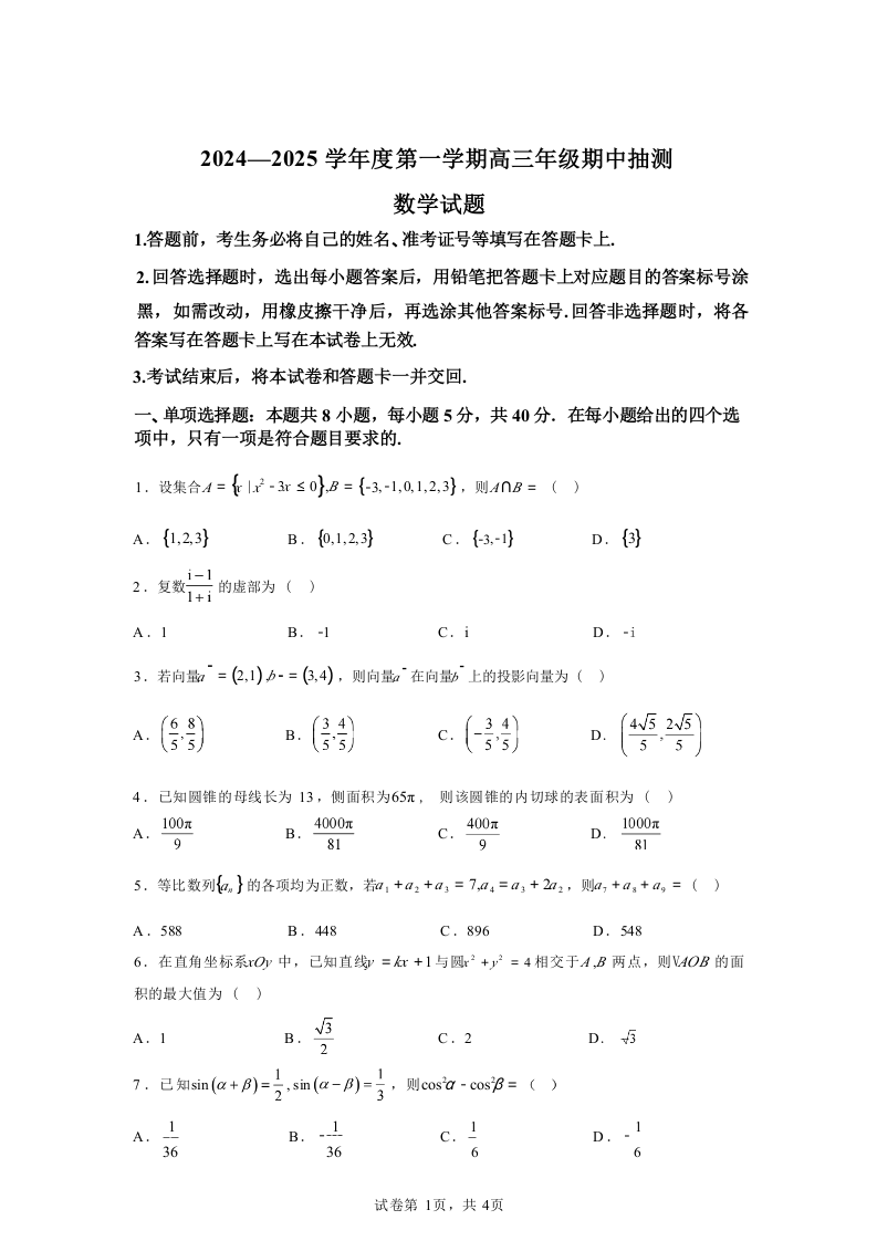 江苏省徐州市2024-2025学年2025届高三第一(上)学期11月期中抽测 数学