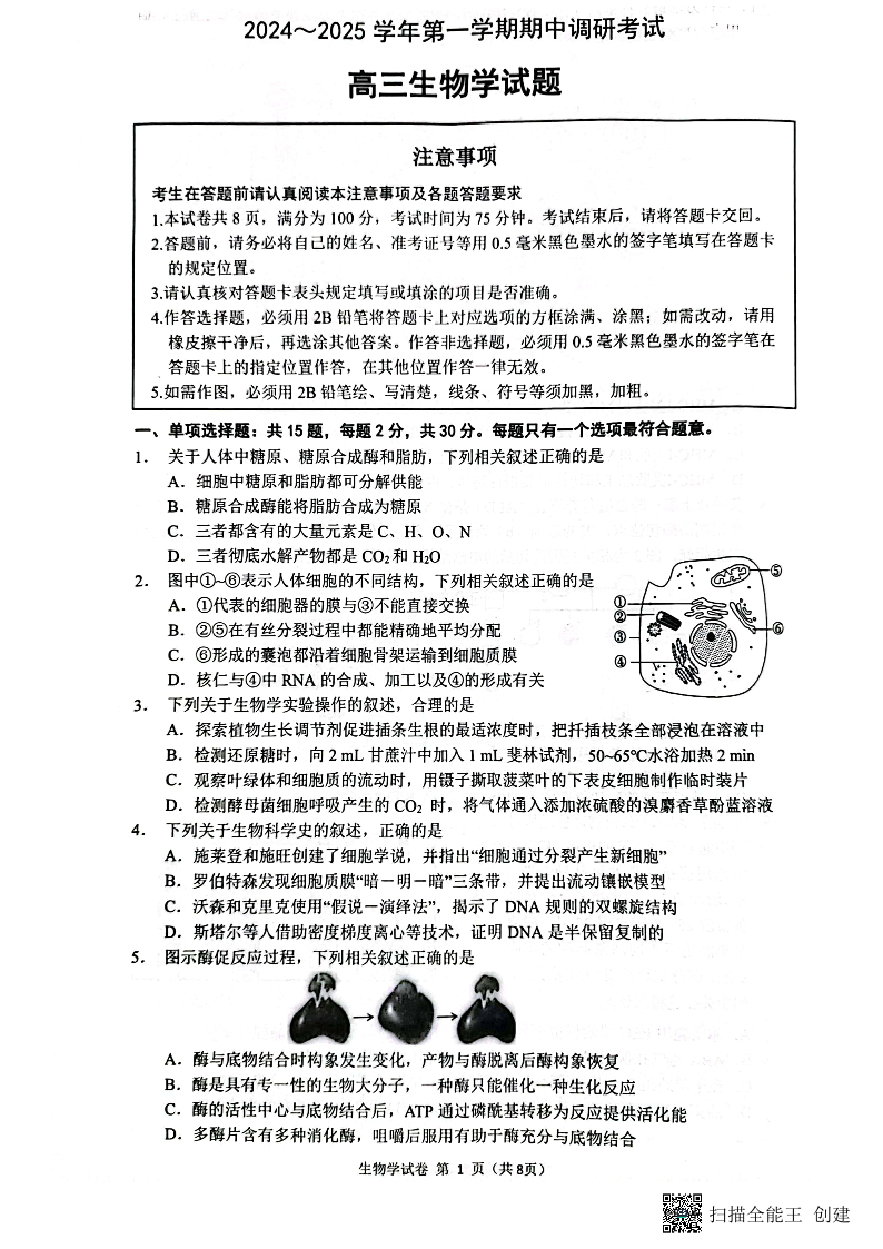 连云港市2024-2025学年高三上学期期中考试 生物