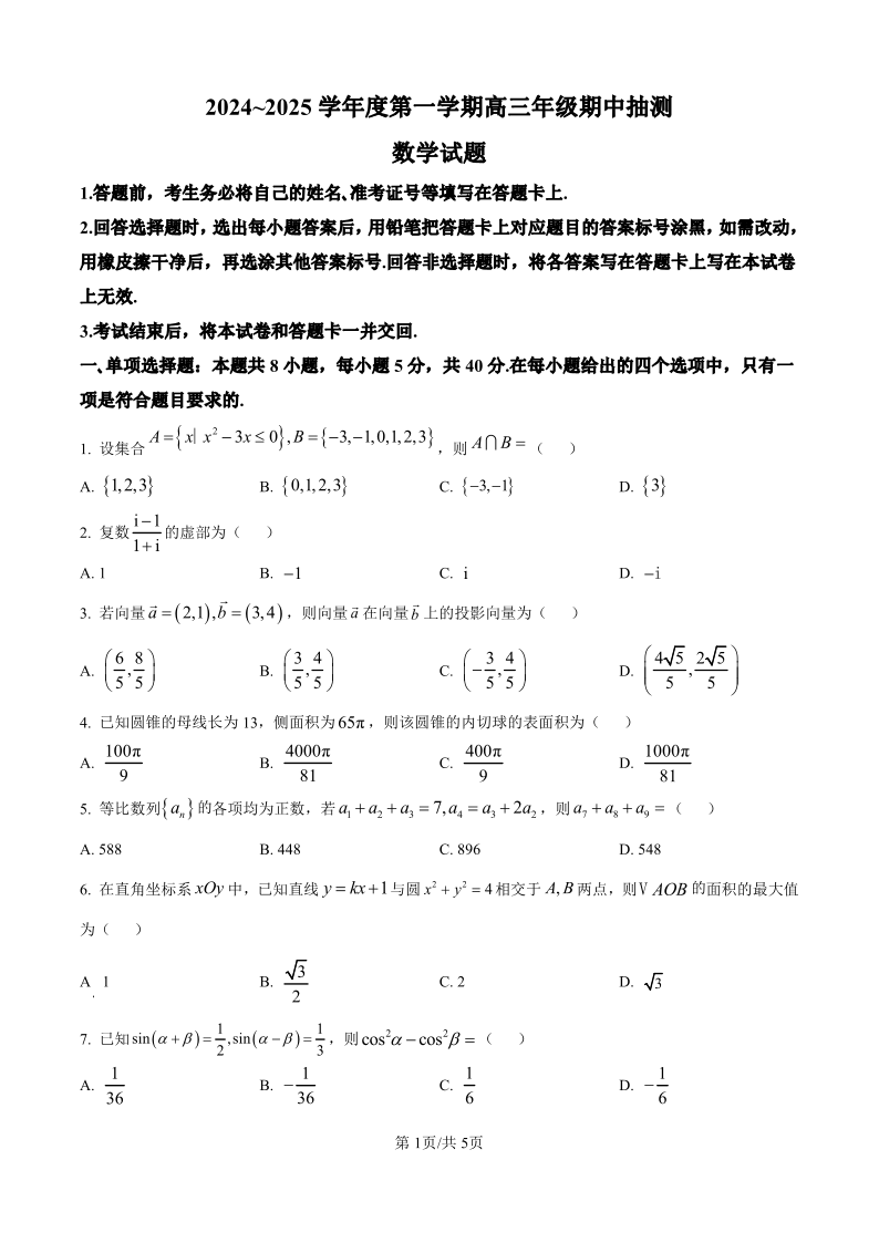 连云港市2024-2025学年高三上学期期中考试 数学