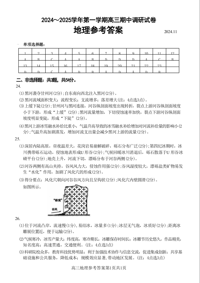 江苏省苏州市2025届高三上学期11月期中调研考试卷 地理答案