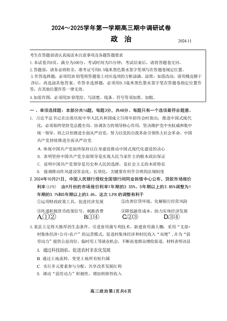 江苏省苏州市2025届高三上学期11月期中调研考试卷 政治