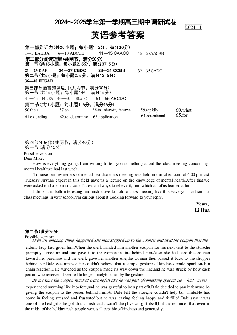 江苏省苏州市2025届高三上学期11月期中调研考试卷 英语答案